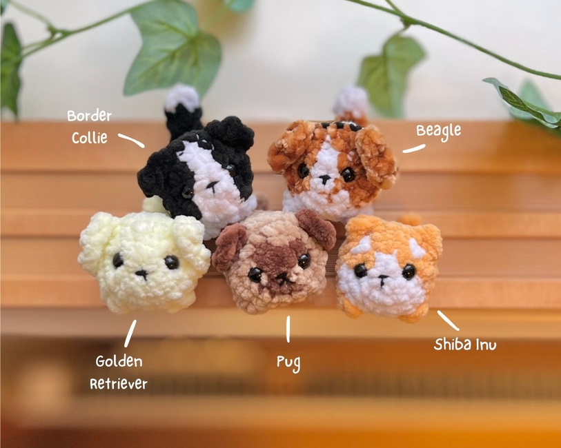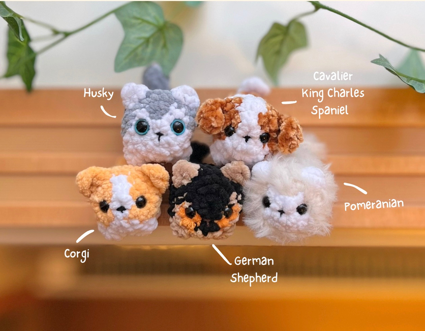 This is a no-sew pattern bundle for making 10 different mini loaf dogs! They're perfect for quick market makes or last-minute gifts and work well either as keychains or mini squishies. This pattern bundle includes instructions for a Husky, Cavalier, Corgi, German Shepherd, Pomeranian, Border Collie, Beagle, Golden Retriever, Pug, and Shiba Inu!