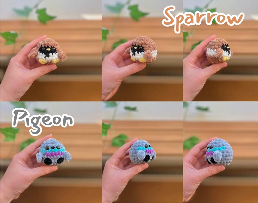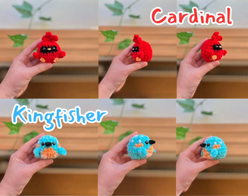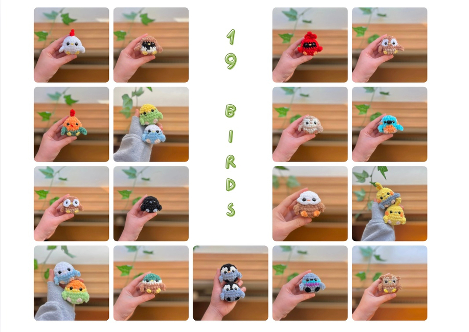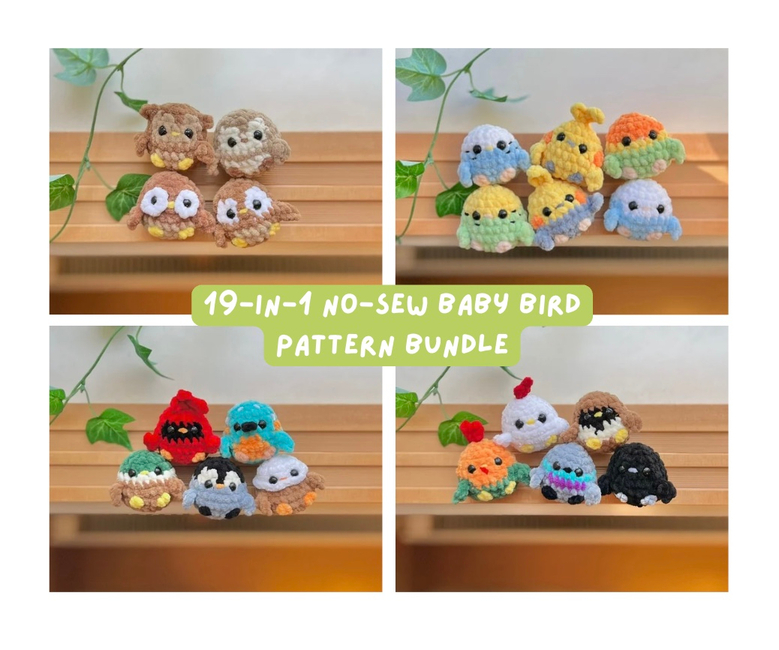 This is a pattern bundle including all 19 of my bird patterns! This bundle includes 6 separate patterns (Bird Bundle #1, Bird Bundle #2, Owl Bundle, Cockatiel Bundle, Lovebird Bundle, and Budgie Pattern). They're great for markets, whether as keychains or little stress balls :)