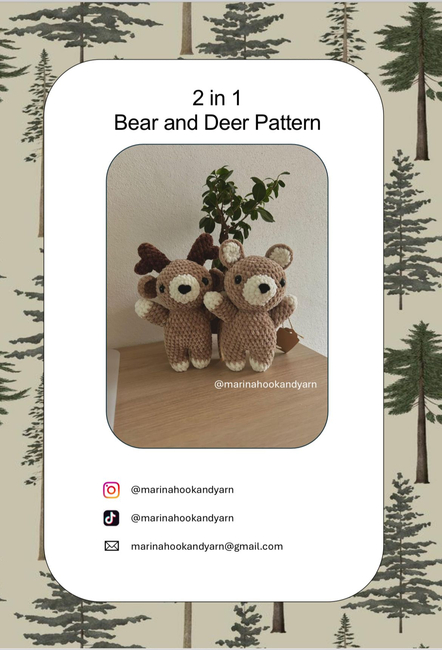 2 in 1: Bear and Deer Pattern is an Intermediate Crochet pattern designed by Marina Hook and Yarn for making an Amigurumi. You will find the instructions to make these cute forest friends. Pattern has been tested by experienced crochet testers.-> toy's dimensions: 25cm (height) x 7cm (width)