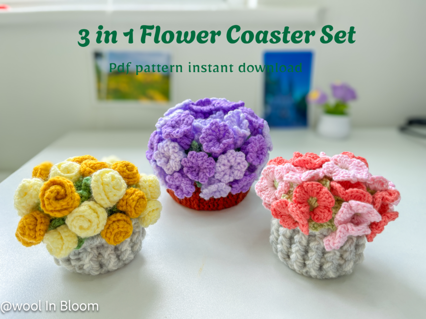 3-in-1 Flower Coaster Crochet Pattern Bundle PDF - Rose, Hydrangea, Bluebell| Beginner-Friendly Floral Crochet Patterns with Basket