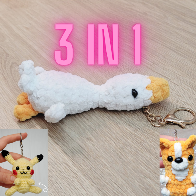 3 in 1 Keychain Bundle. Little Goose Bird, Pikachu Pokemon, Corgi Puppy Dog. Softie Amigurumi