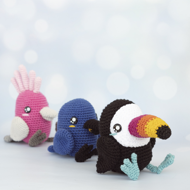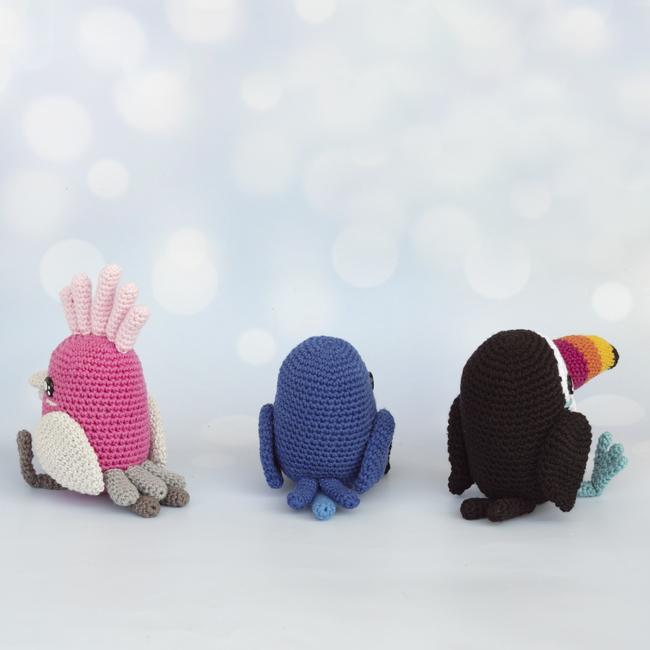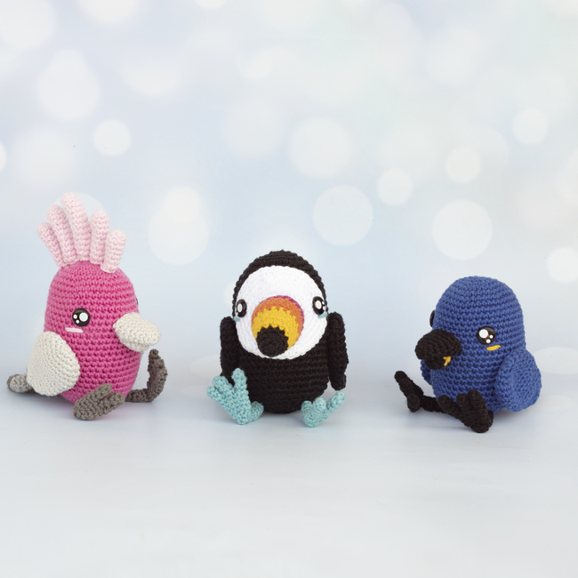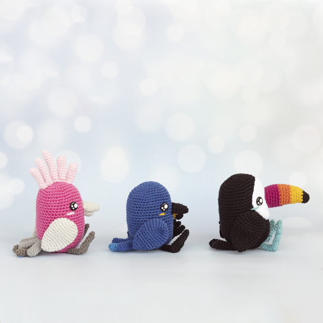 You will find step-by-step instructions for crocheting 3 tropical birds (toucan, blue macaw and cockatoo).