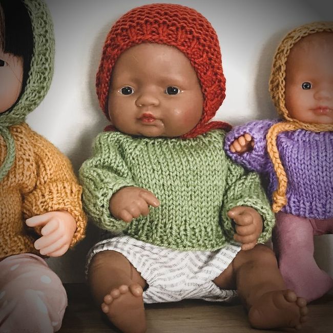 This top-down raglan style jumper is made to fit the 32cm Miniland Doll or any doll with the following measurements: