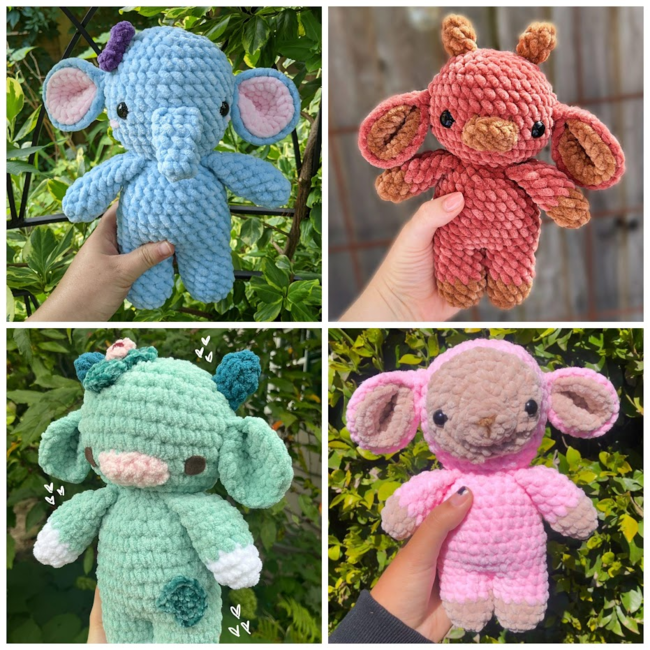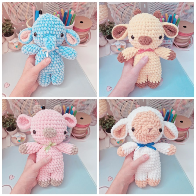 this is a bundle of 3 low sew crochet patterns written using US terms (Click Ribblr's preference icon to change to UK), they include all the instructions on making 4 different zoo animals: elephant, giraffe, cow and sheep!