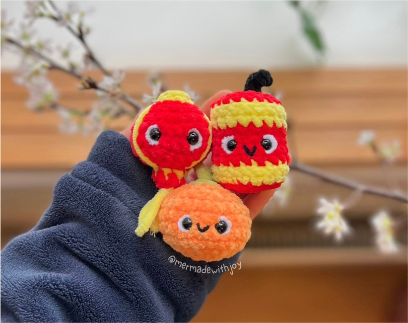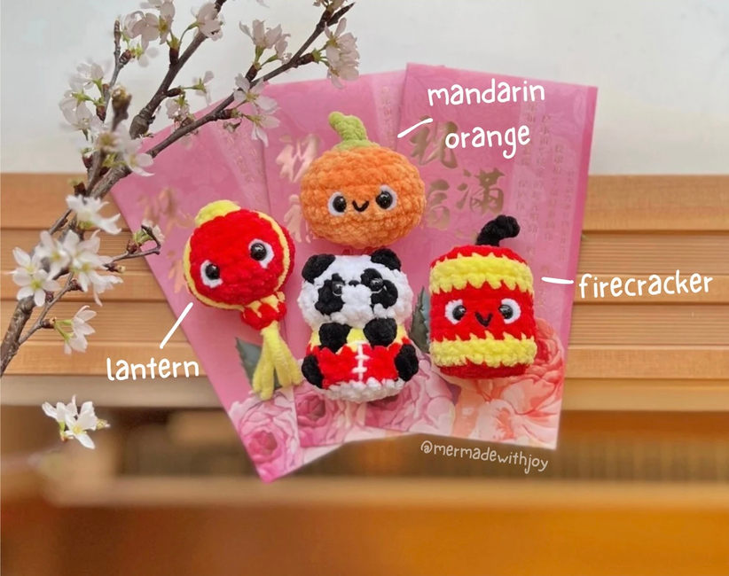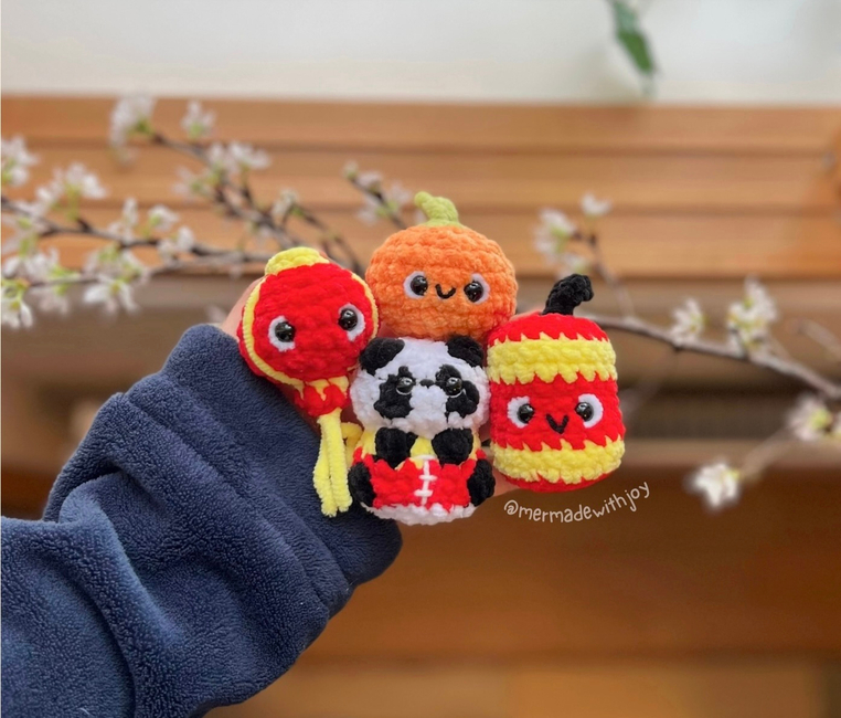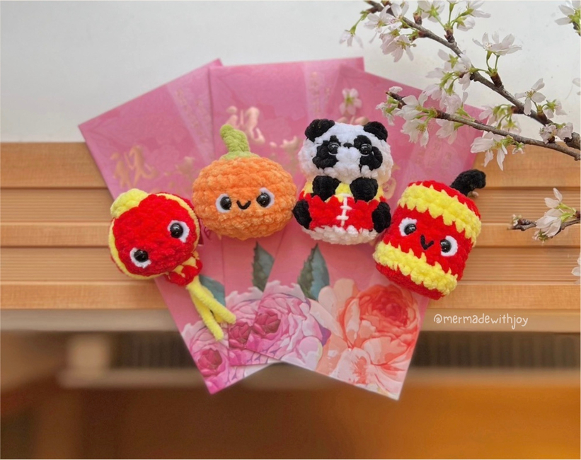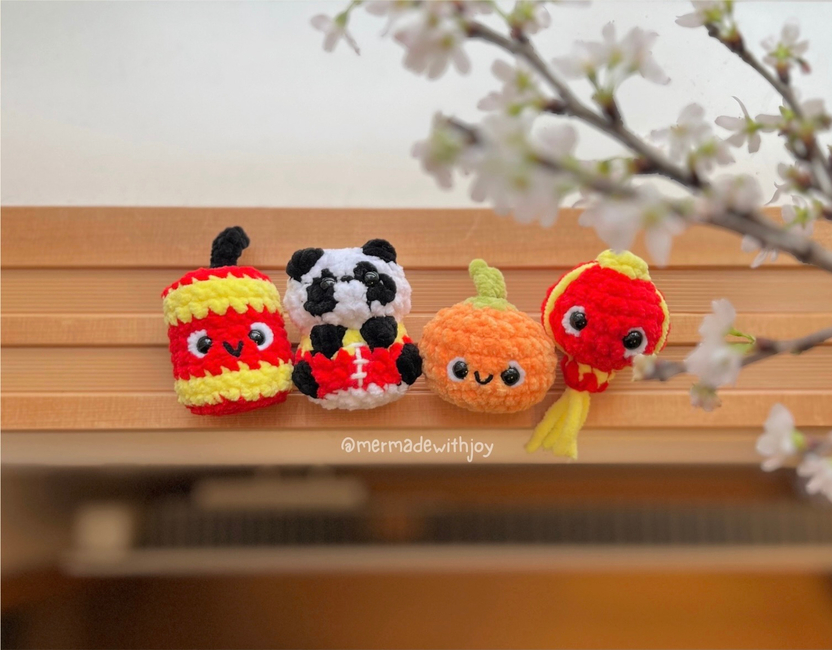 This is a 4-in-1 crochet pattern bundle for making a cute little panda and some of his CNY friends (lantern, mandarin orange, firecracker)!! They are all quick to work up and no-sew, although they do require embroidery for details (optional but recommended as a finishing touch)!