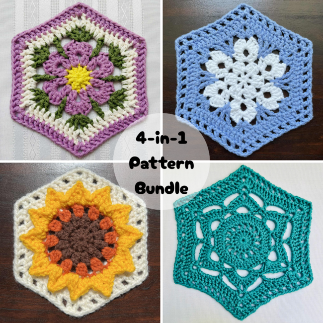 The granny hexagon crochet pattern bundle contains four beautiful hexagon motifs that can be used for a variety of projects, such as blankets, bags, coasters, and garments. These patterns are suitable for advanced beginners and beyond. Each pattern contains easy-to-follow instructions and process photos to guide you through each step.