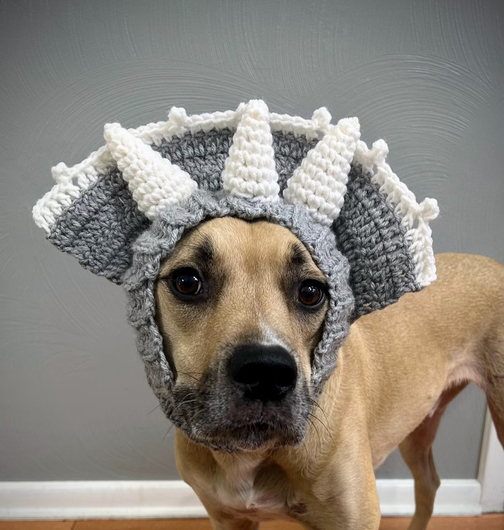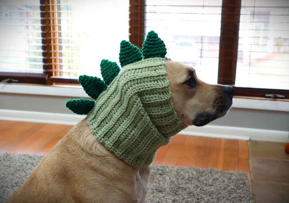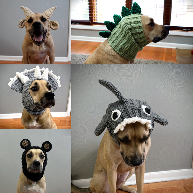 Bundle of 5 dog snood patterns: dinosaur, goat, black bear, triceratops, and shark.