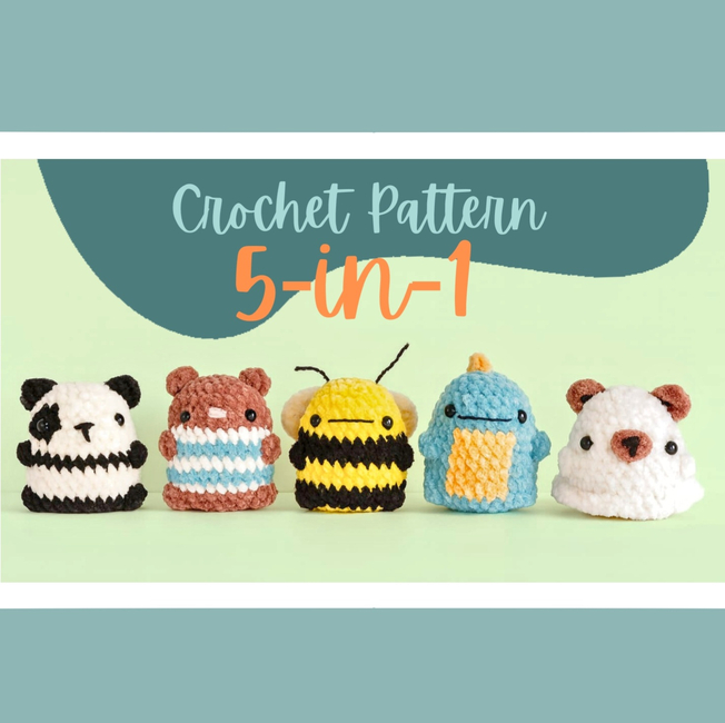 This 5-in-1 crochet pattern bundle includes Cheddar the Mouse, Rory the Dinosaur, Pumpkin the Ghost Bear, Chubby Bumbee the Bumblebee, and Baobao the Panda. Each one has their own quirky personality from Rory's derpy dino grin to Pumpkin's not-so-scary ghost disguise. Together, they're the ultimate set of chubby companions, perfect for market prep, gifting, or building your own amigurumi army.