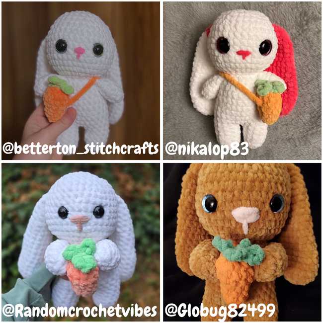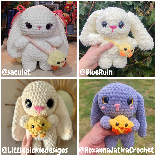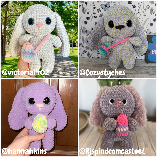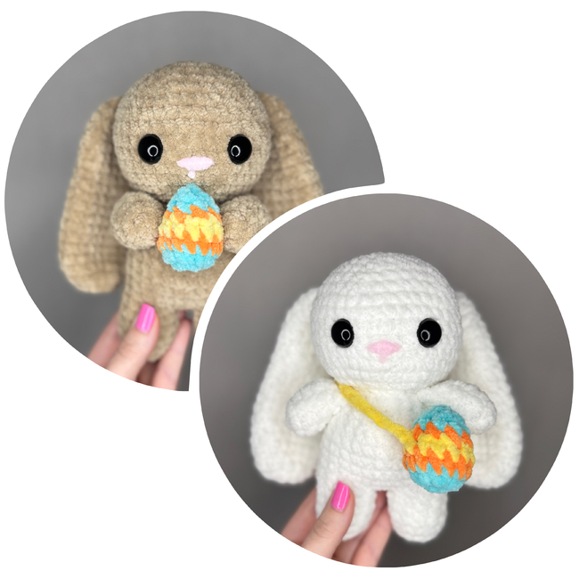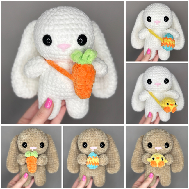 Main color (less than 3/4 of a skein of parfait chunky in colors white or toffee) Carrot, egg, and chick color (small amount of parfait chunky in color tangerine) Carrot top color (small amount of parfait chunky in color key lime) Main egg color (small amount of parfait chunky in color turquoise) Egg and chick color (small amount of parfait chunky in color sunshine) Blush color (small amount of parfait chunky in color cotton candy)