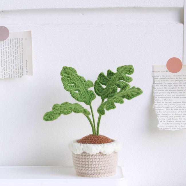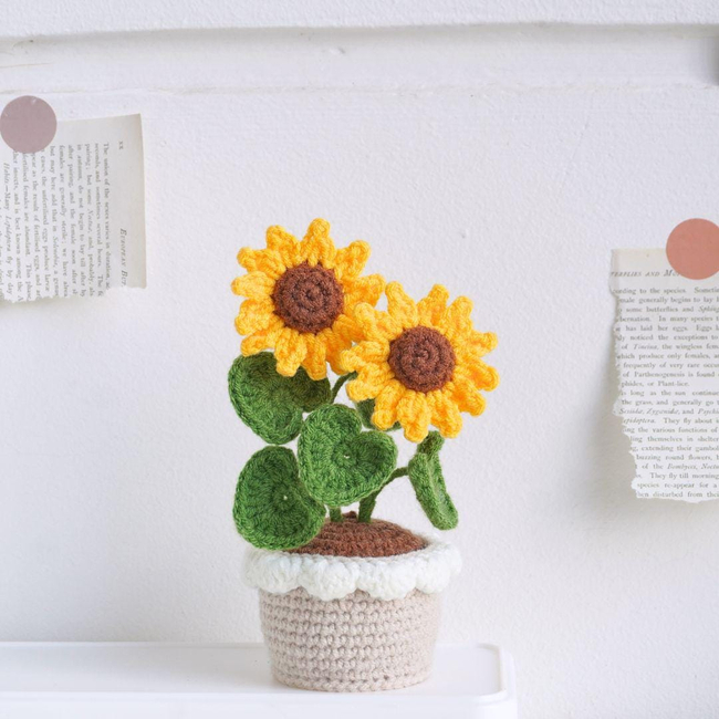 A stunning set of six crochet flower pots, including sunflowers, daisies, tulips, and more. Each pot is uniquely designed with vibrant blooms and detailed foliage, presented in matching beige pots with white scalloped edges.
