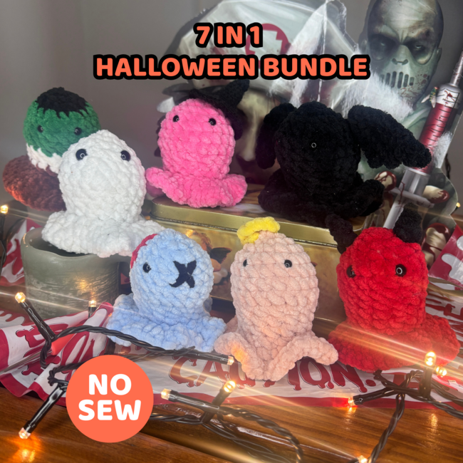 Get all the spooky fun in one bundle! This 7 in 1 Halloween Ghost Crochet Pattern Bundle includes seven unique no sew amigurumi ghost patterns: Witch Ghost, Devil Ghost, Angel Ghost, Zombie Ghost, Bat Ghost, Frankenstein Ghost, and Classic Ghost.
