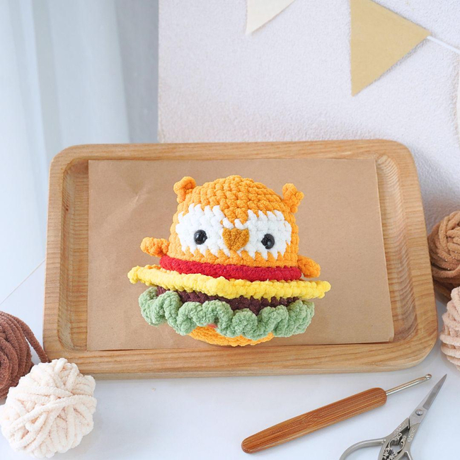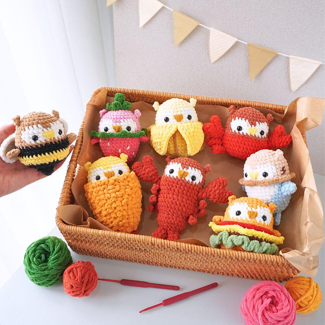 A playful collection of adorable owls dressed as different food items, including a bee, strawberry, crab, banana, shrimp, hamburger, and more. Each owl features vibrant colors, detailed textures, and a charming personality.