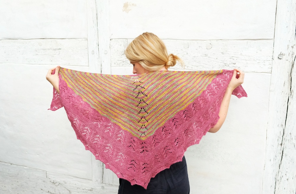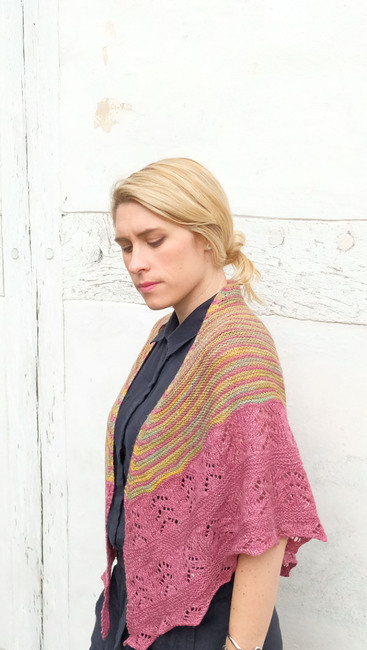 Knit One, Crochet Too designed the Aarhus Shawl 2422 pattern. Find more of their patterns on their Ribblr shop page.