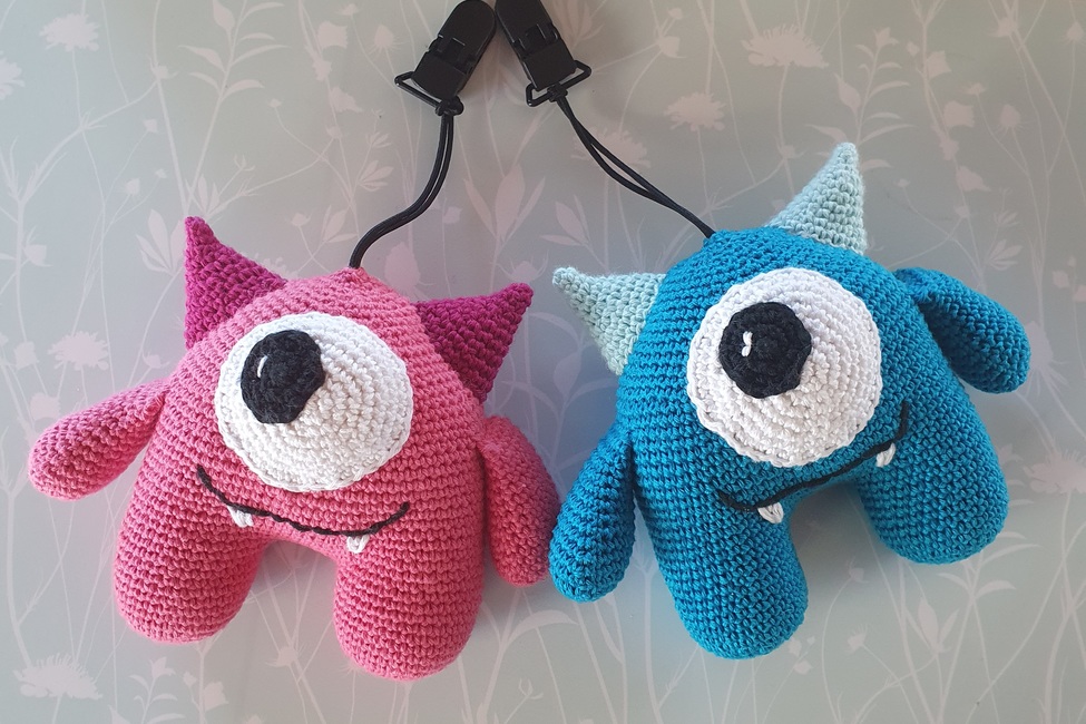 This pattern is for a hanging monster, that you can use to hang from a baby carriage, a baby car seat or anywhere, a baby might enjoy to look at it.