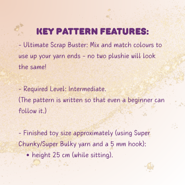 - Finished toy size approximately (using Super Chunky/Super Bulky yarn and a 5 mm hook) - height 25 cm (while sitting).