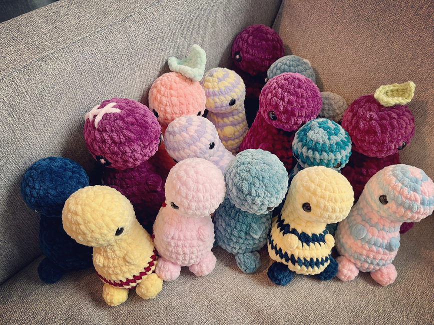 Introducing Alfanzo the albino dino. Of course you can make it in any color. Also it is pretty easy to customize. I made it in various designs which is in the pictures. I hope you find this pattern easy to make and please give me a credit as a pattern designer. If you have any questions about my patterns, feel free to message me. Follow me on my IG @munolushop, so you wont miss out my new makes.