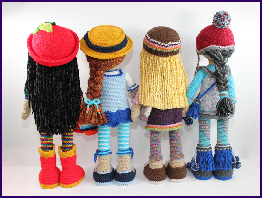 This listing is for 4 crochet patterns to make the pictured Emma, Fay, Gabi, and Hanna large dolls.