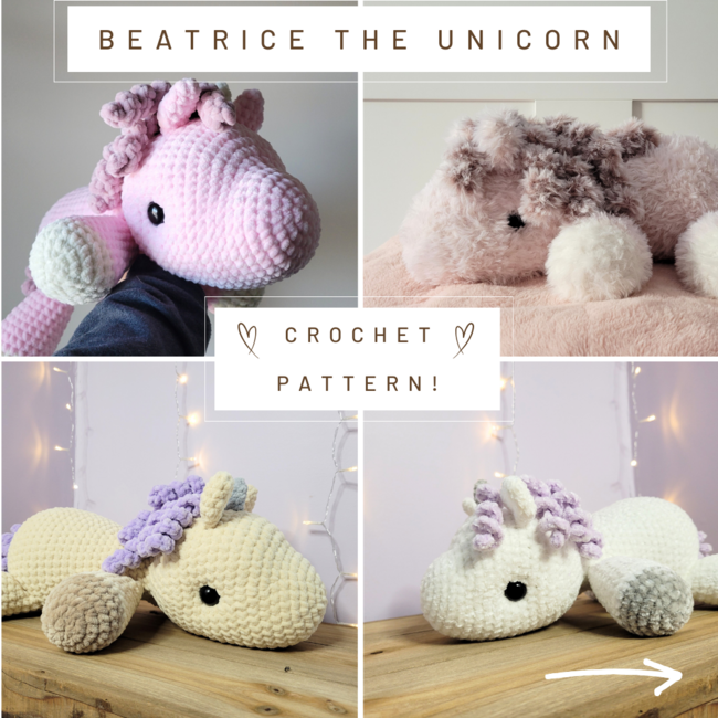 Beatrice is my extra-large unicorn pattern. She makes the best snuggle buddy and gives the greatest hugs around!