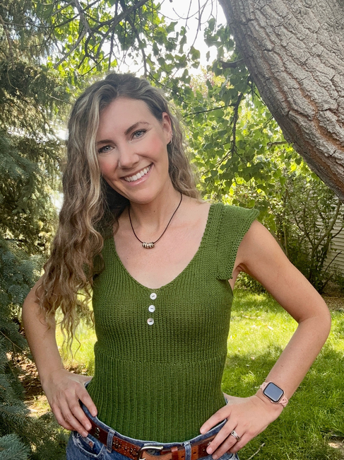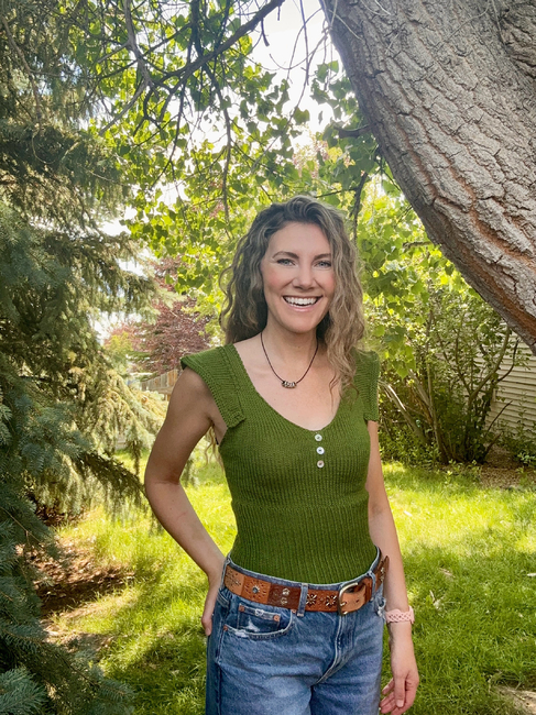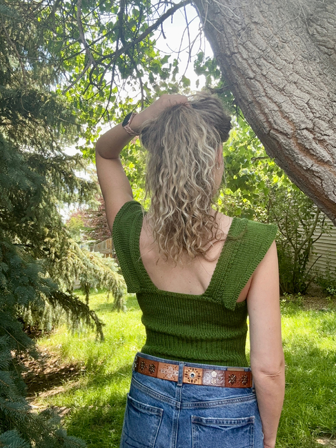 This worsted/dk design is crafted in a bottom-up fashion, beginning with form-fitting ribbing that smoothly transitions into a stockinette bust featuring increases. The straps are knitted and then seamed to the back, while the ruffles are picked up and knitted flat. Decorative buttons finish off the tank, adding a charming touch that enhances its country-chic aesthetic.