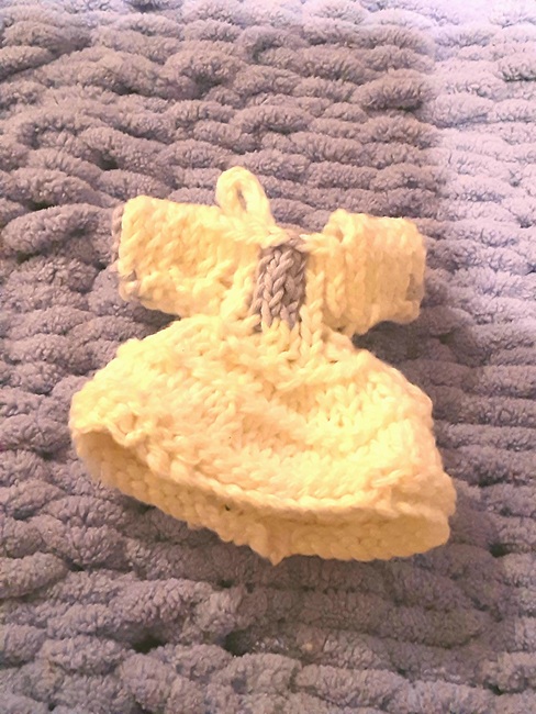 This adorable dress knitted dress has an adorable tie-back and knitted details on the skirt. It is three and a half inches long. It will make an adorable Christmas ornament or dress for a small doll. This dress is worked from the skirt up. The skirt is worked on the round and the top of the dress is worked flat.