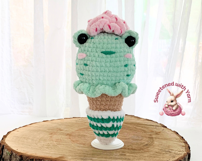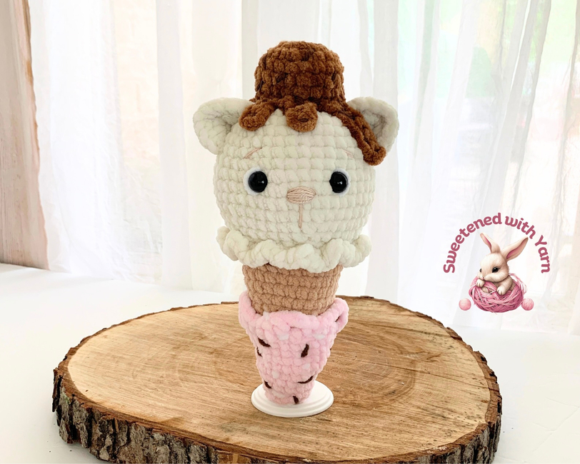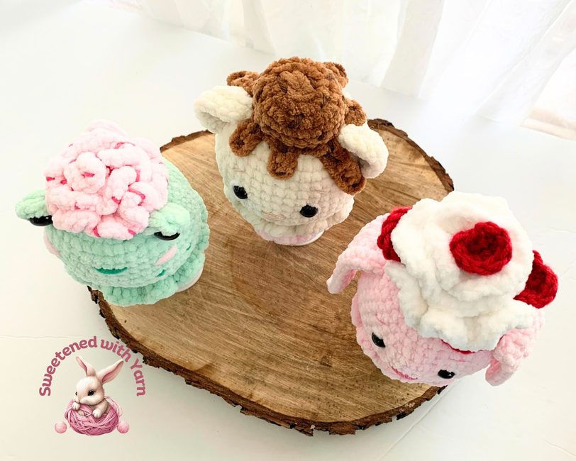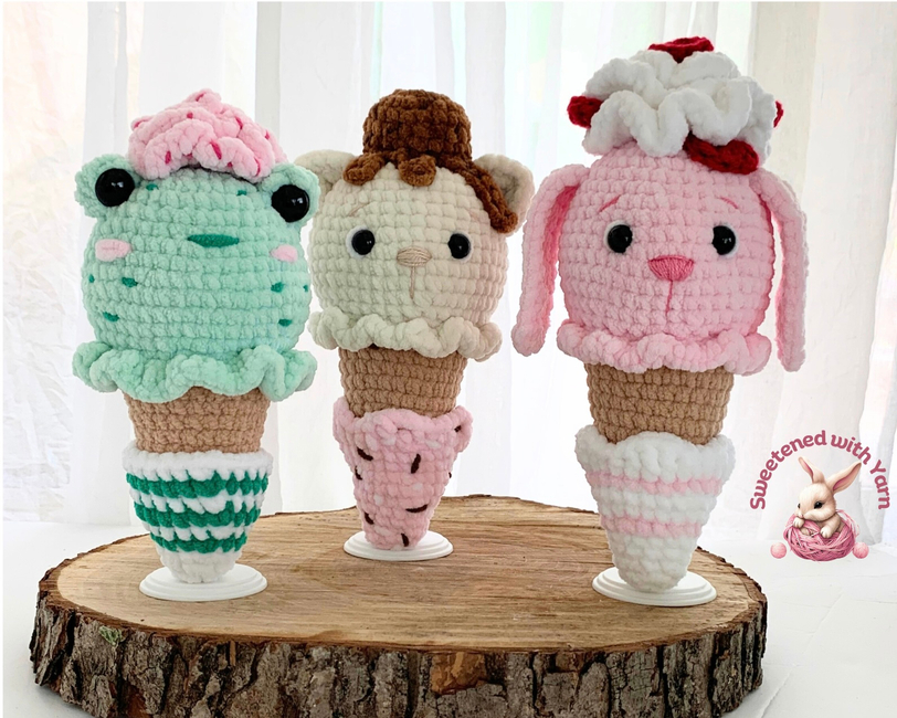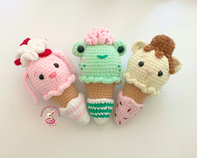 These adorable bunny, cat, and frog-shaped ice creams are a truly delightful treat! The cones are available in a variety of animals ... bear, koala, tiger (zoo collection), duck, cow, pig (farm collection), (and many more to come). Each crochet is a quick, whimsical journey, perfect for market makes or a relaxing project at home. Mix and match the toppings, and change the colors for even more options!