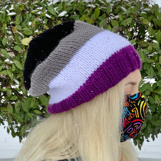 Show your pride with this simple yet stylish slouchy beanie! Worked flat with stockinette stitch and ribbing, it is a great pattern for beginners looking to branch out with some new techniques.