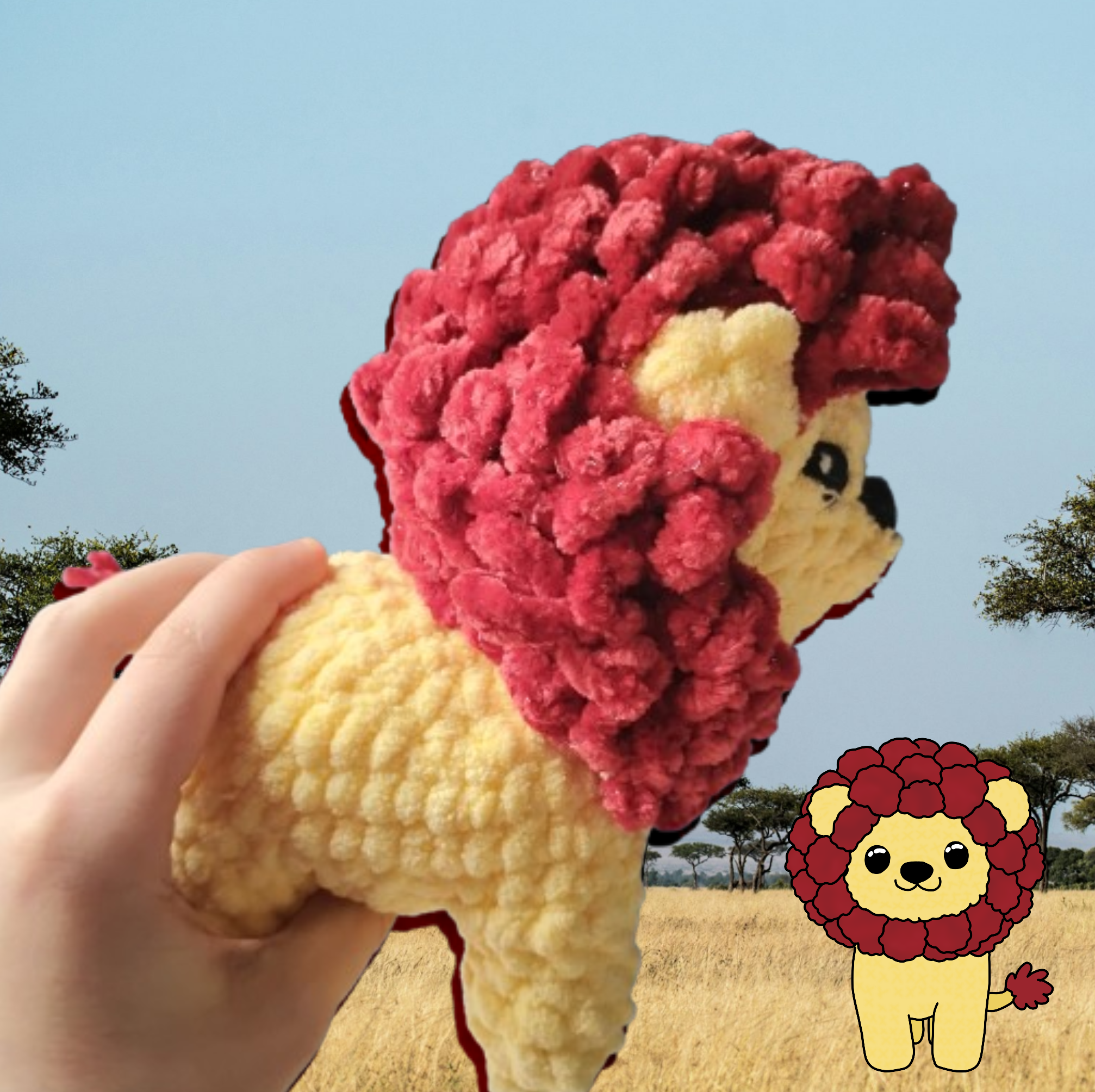 The legs are joined directly to the body without sewing, giving the lion a smooth, seamless look. The head and ears are sewn on at the end for a clean finish. You'll stuff the lion gradually throughout the pattern to keep the shape even and sturdy. My sample lion is made in bright yellow and red, but feel free to customize your colors and mane style to make your own unique lion.
