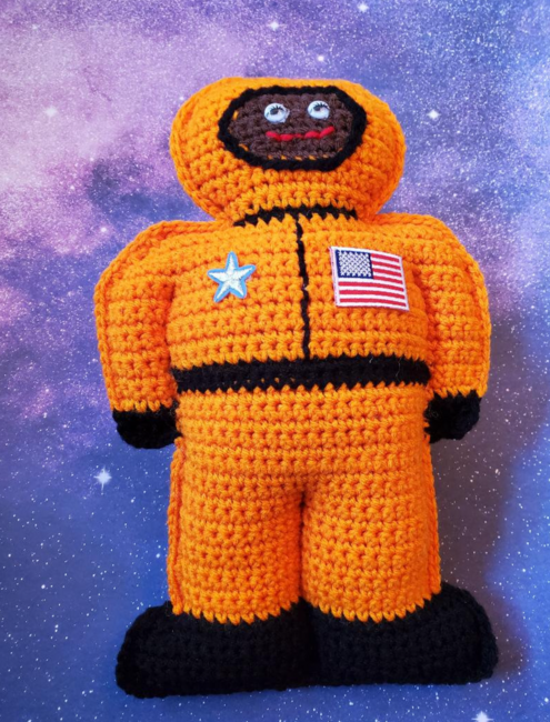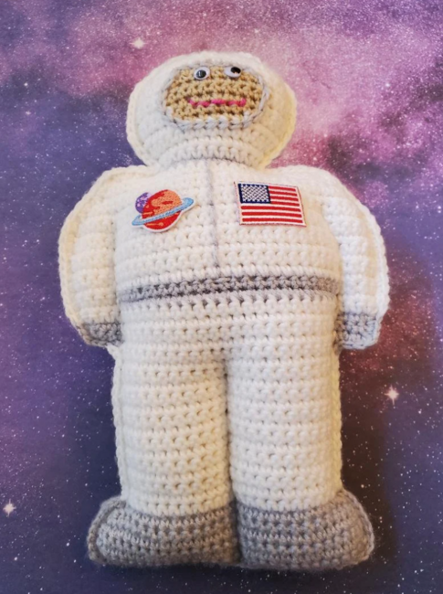 When your child thinks of nothing else but being an astronaut, crochet this cute cuddler for him or her. Make several with different colored uniforms and different flesh tones to populate your child's imaginary spacecraft. Crochet pattern includes color-coded chart for front and back sides. Crochet in worsted weight yarn with a size G hook. If making for a child under 3 years old, you can embroider on the eyes and buttons instead of using plastic eyes and buttons.