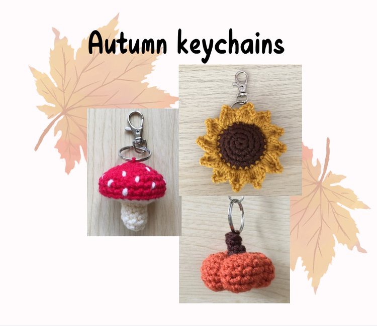 This pattern bundle includes my sunflower, pumpkin and mushroom keychains.