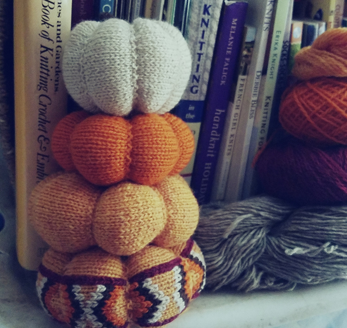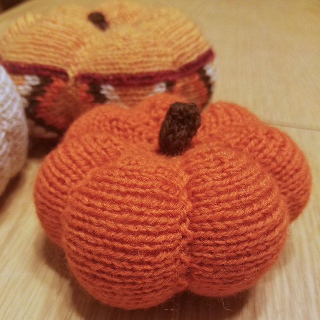 A trio of knitted pumpkins to spice up your Autumn décor. The shaping is achieved through the use of short rows, a single garter stitch row and some gentle soft-sculpting. Knit these up quickly in your choice of colors. The duplicate stitch colorwork on the large pumpkin is optional.