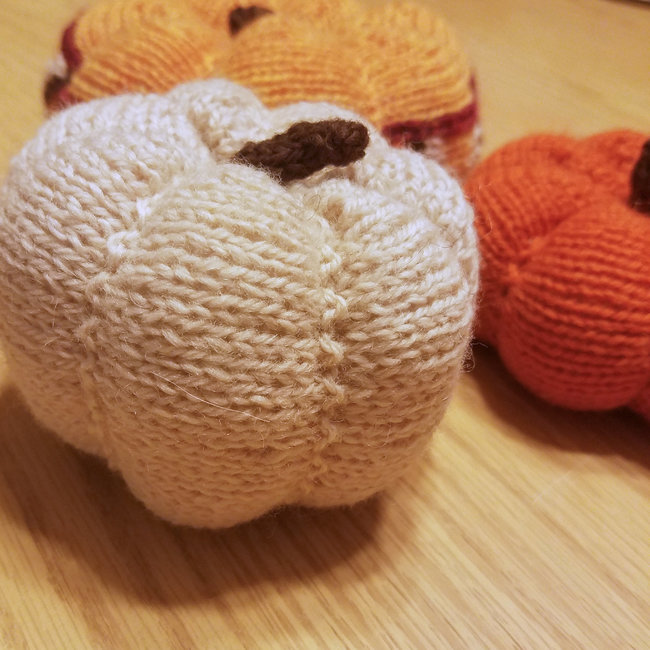 To make Autumn Pumpkin Trio you will need: Knit Picks Palette, Golden Heather 56 yds, Orange 42 yards, small amount Bark and Garnet Heather for stems and optional embroidery., approx. 80 grams (2.8 oz) Fiberfill stuffing. Tools required: One pair size US3 Straight or circular needles and one set of size US3 Double point needles for stems., one tapestry needle.