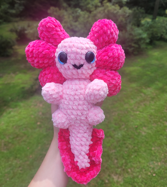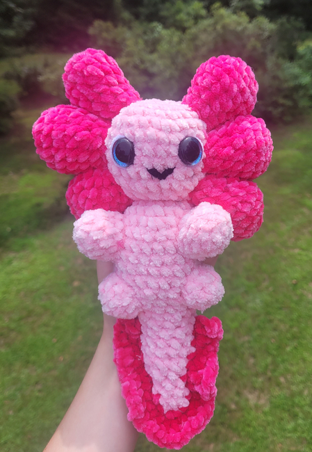 This cute axolotl is sure to make someone's day! You can customize it to have any color combo, and almost any yarn type. I made mine using light pink and hot pink velvet yarn.