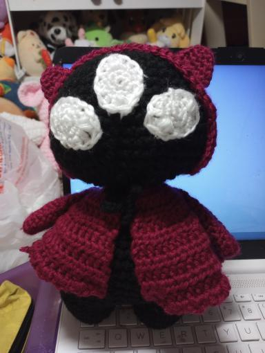 To make azazel the demon cat/rosier the angel cat you will need: black dk yarn for Azazel@qs body (or you can use whatever color you want), light green dk yarn for Azazel@qs eyes (or you can use whatever color you want), lilac for Rosier@qs cloak (or you can use whatever color you want), white dk yarn for Rosier@qs body (or you can use whatever color you want), burgundy dk yarn for Azazel@qs cloak (or you can use whatever color you want), beads for the eyes, a button if you want to sew it on the cloak, stuffing. Tools required: hook size of your choice depending on the yarn you use, darning needle, embroidery needls, stitch marker, glue for the beads, embroidery thread for the eyes in case you don@qt want to glue them.