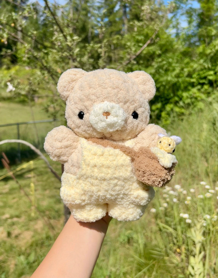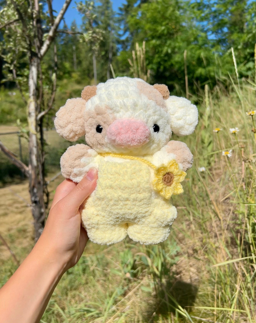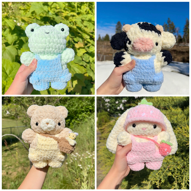 This bundle includes 4 patterns: bunny in overalls + hat, cow in overalls, frog in overalls, and honey bear in overalls + honey pot bag! All patterns are beginner-intermediate.