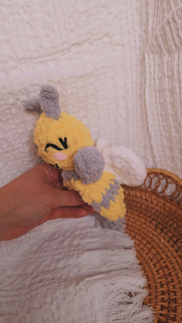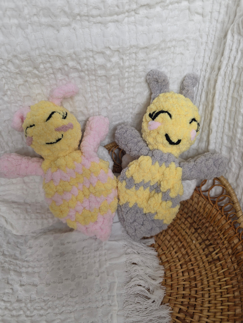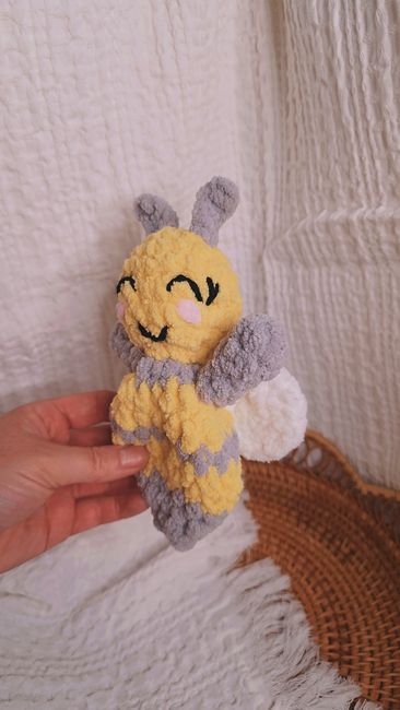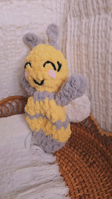 This pattern is a mini version of the Benny Bee pattern I created. I wanted to make a smaller version, that is the perfect size for a child's hand. The head is the only part that is stuffed, making this the perfect combination of a blanket and stuffed animal. This pattern is beginner friendly, no sew, and works up fast
