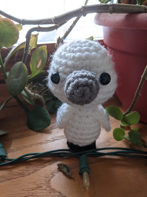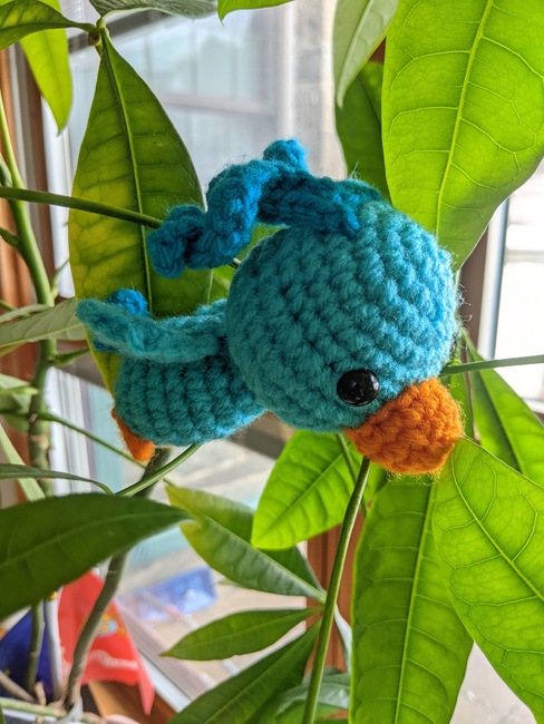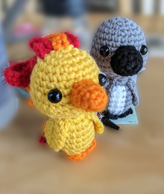 This is a pattern to make a baby bird just under 4 1/2 inches tall. It takes a small amount of yarn (much less than a full skein) for each color. I used the same weight yarn for all parts, but feel free to experiment with different sizes. This pattern uses a 3.5mm hook and weight 4 yarn