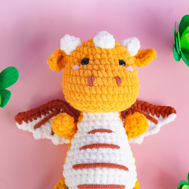 To make Baby Dragon Crochet Pattern you will need: Color: Yellow, white, reddish brown, and a small amount of pink, Stitch markerSewing needleScissorsPlastic safety eyes (9mmx2)Fiberfill. Tools required: 4.0mm.