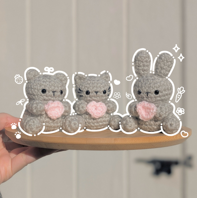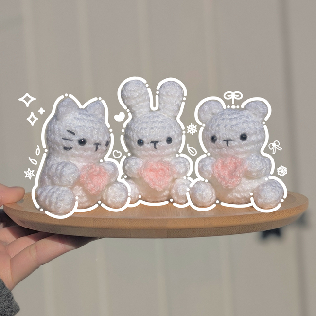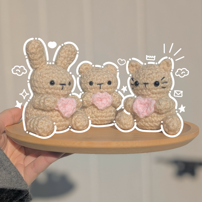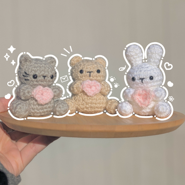 Includes patterns to make 3 small sitting animals [Bear/Bunny/Cat] and how to make a tiny heart for them to hold.