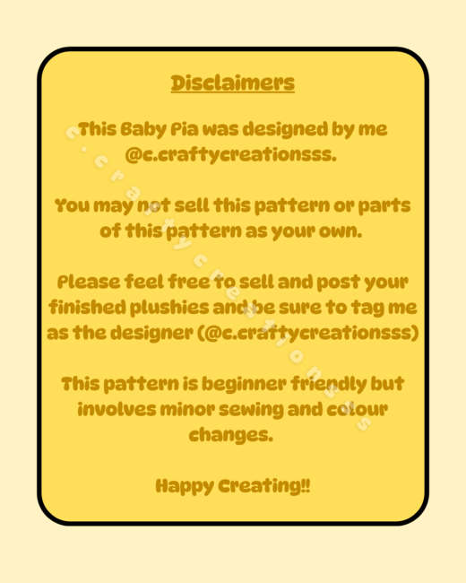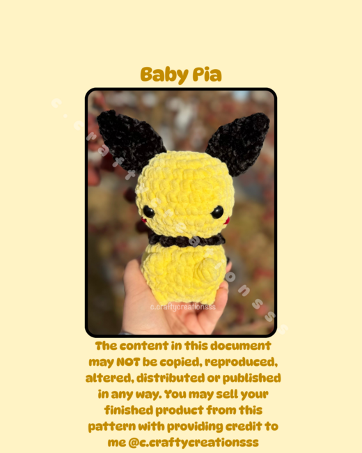 Baby Pia is a Beginner Crochet pattern designed by c.craftycreationsss for making an Amigurumi. Hello!Thank you for supporting my business!For access to the pattern, please take a look at each of the photos.If you have any questions, please send me a message to any of the following accounts:Email: c.craftycreations11@gmail.comInstagram: c.cr...