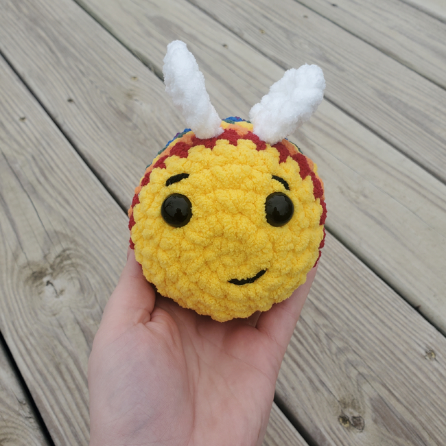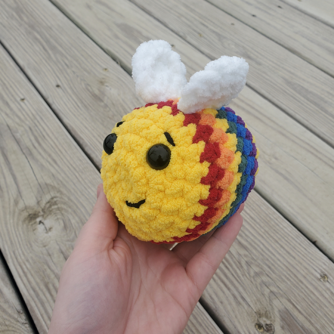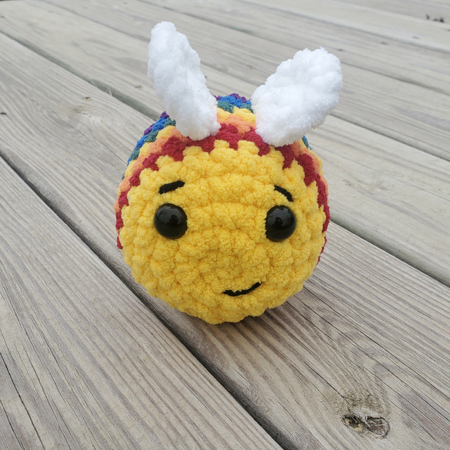 This bee is the perfect for the gift or to sell. This works up rather quickly and is a customer favorite for me. I love playing with the colors I make this in and have done regular black and yellow bees, rainbow ones,