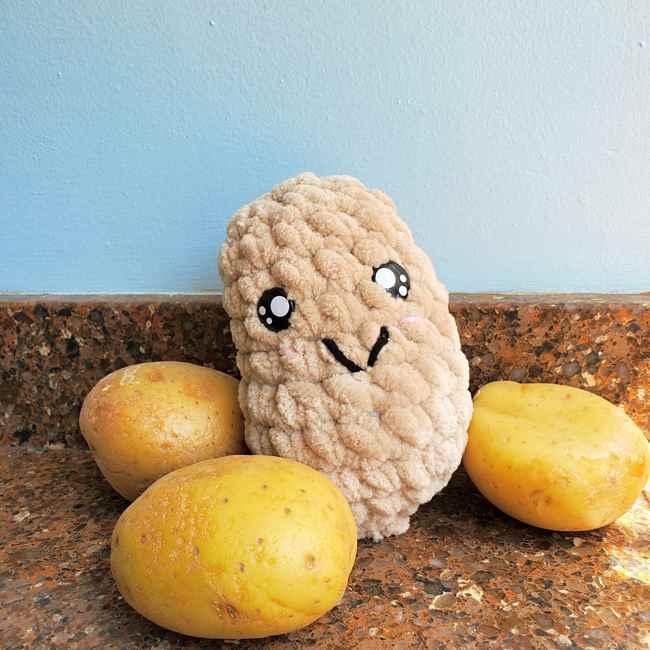 Hey tater tots! Crochet a potato plushie with this beginner amigurumi pattern! Made with soft yarn by Loops & Threads. Add a face for the ultimate kawaii look, or keep things simple! Easy no-sew amigurumi pattern.