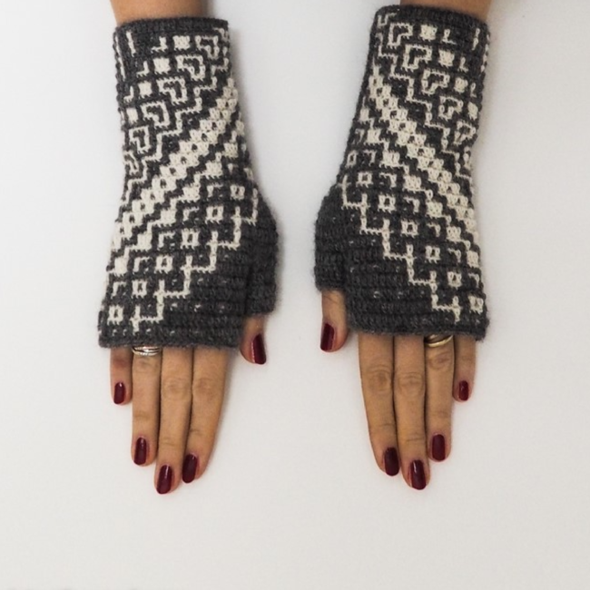 This crochet bundle includes four ethnic Lithuanian style patterns - Fingerless Gloves & Mitts as well as Hat & Cowl sets.