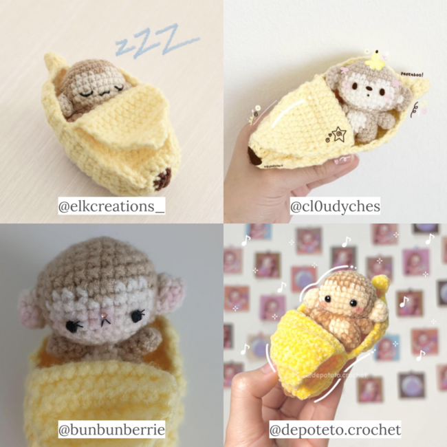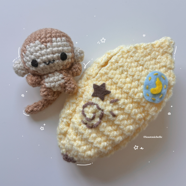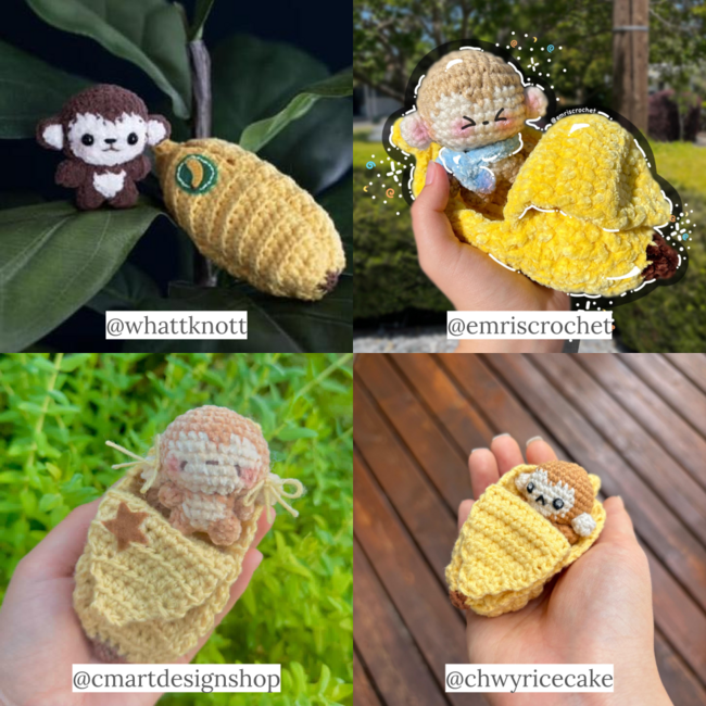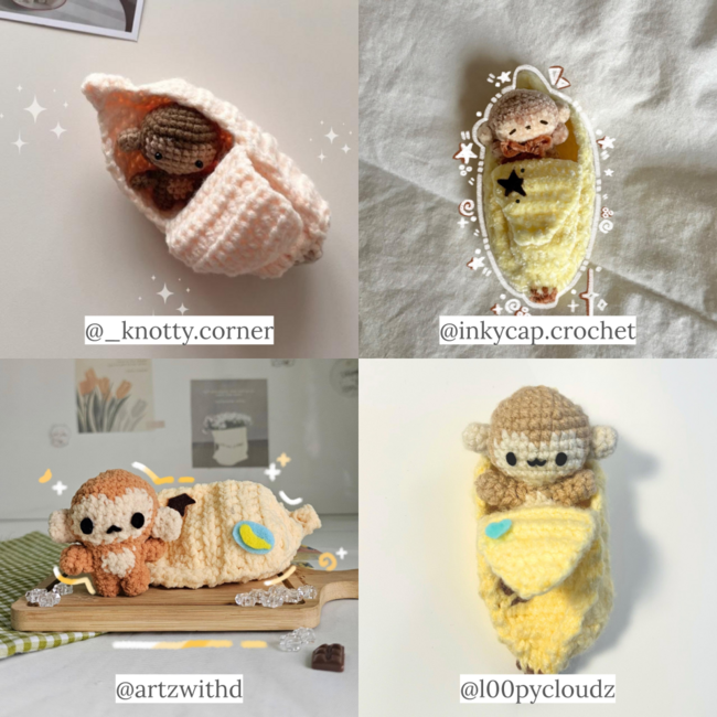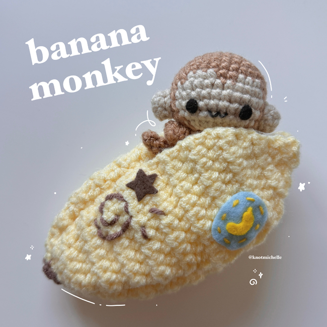 The monkey uses a 3.75mm hook while the banana uses a 4.5mm hook unless stated otherwise. You want the banana to be made with a bigger hook (about 0.75mm-1.00mm difference) in order for the monkey to fit inside.