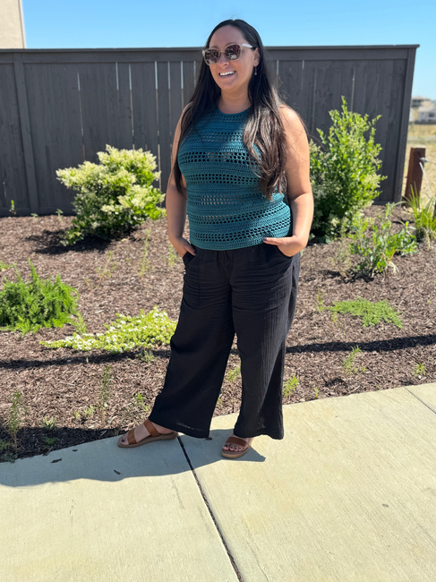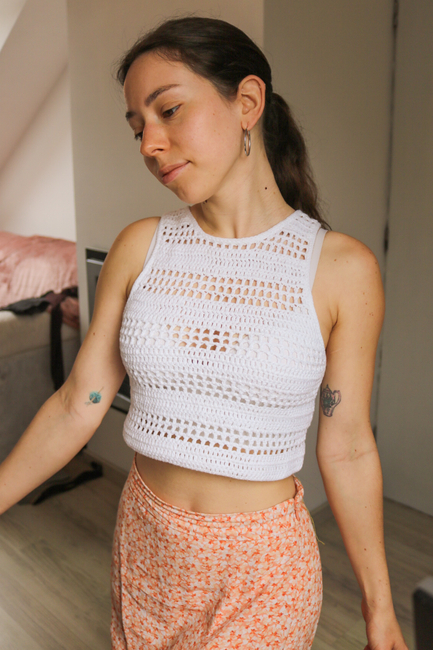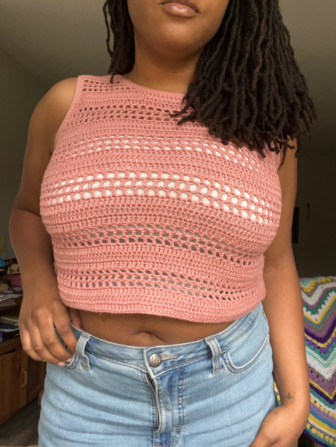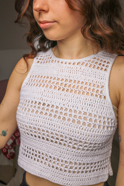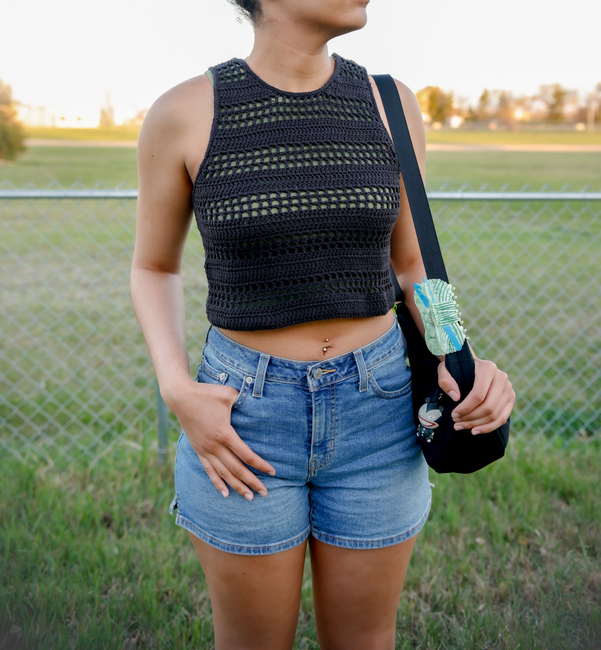 The Bari Top is a light, modern crochet tank that's perfect for layering or wearing on its own in warmer weather. It can also be worn as a beach cover-up. The design features alternating stripes of mesh and solid fabric.