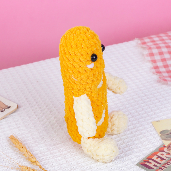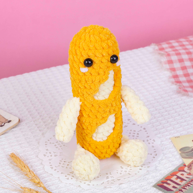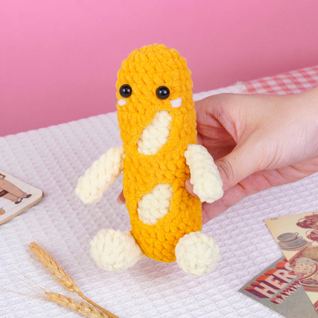 To make Baugette Crochet Pattern you will need: Color: Light yellow, dark yellow, pink, Stitch markerSewing needleScissorsFiberfillPlastic safety eyes (9mm x2)Hot glue gun. Tools required: 4mm (G/6) Hook.