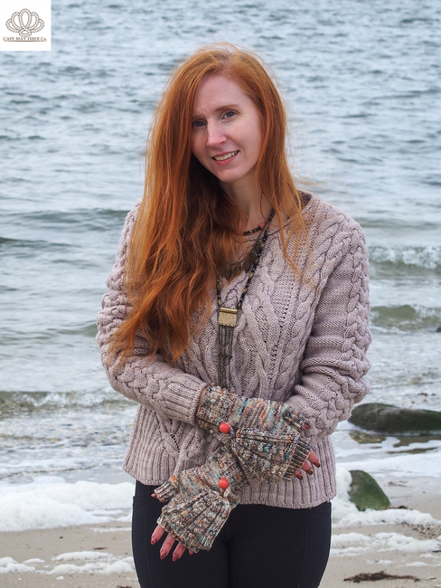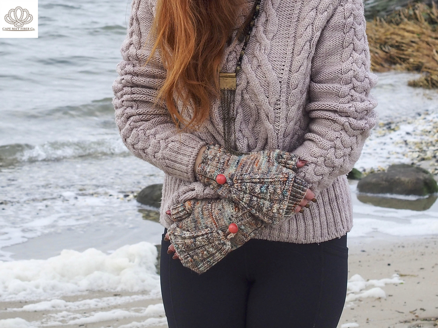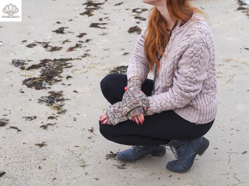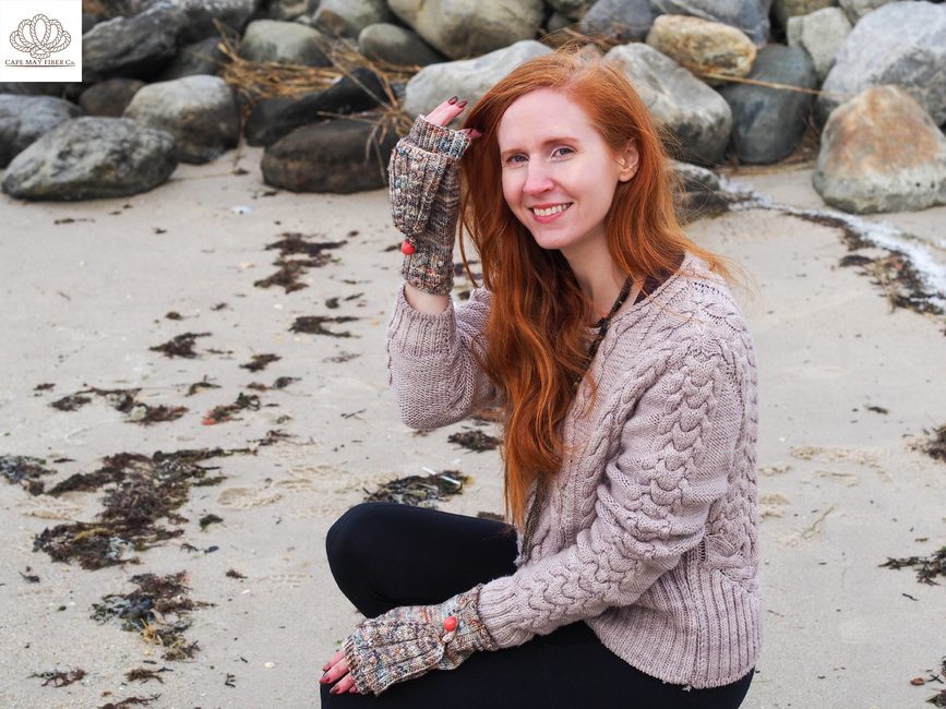 Vanessa Ewing Knits designed the Beach Pebble Mitts pattern. Find more of their patterns on their Ribblr shop page.