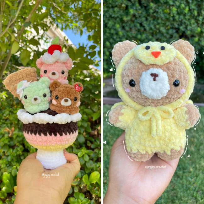 Bear Bundle includes 2 patterns: Beary Sundae and Bear in Duck Costume. Both patterns are beginner-intermediate level and any yarn type/ colors can be used.