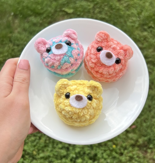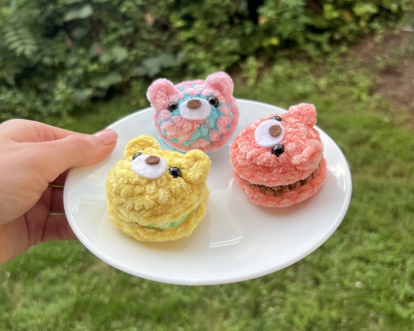 These tiny bear desserts are the perfect addiction to your crochet collection! This pattern is very customizable. You can make any flavor of macaron you wish. Be creative!! :)
