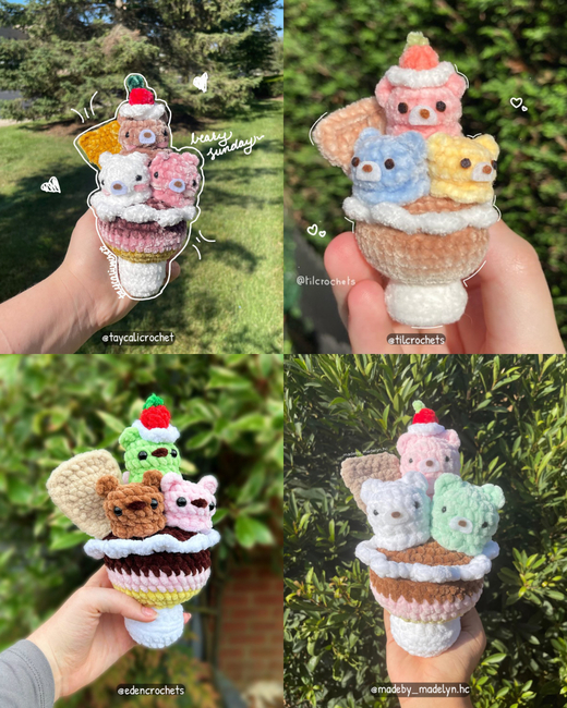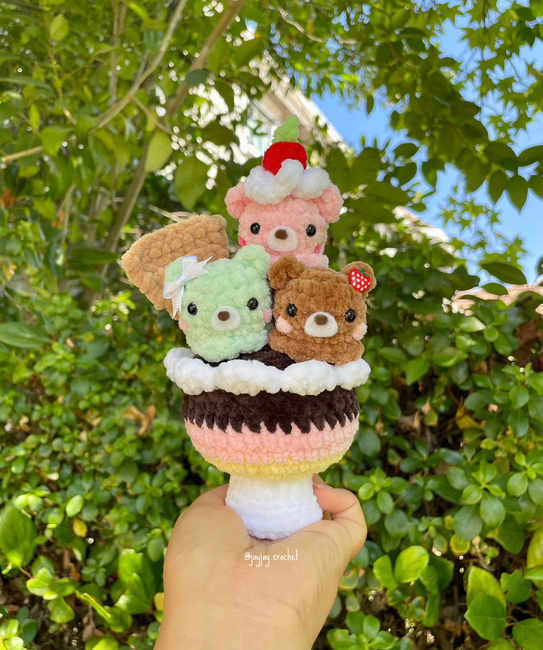Bear-y Sundae is the sweetest crochet pattern around! This pattern is suitable for advanced beginner to intermediate crocheters with experience in sewing, felt cutting, and color changing.