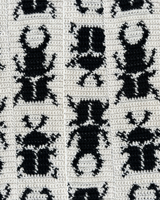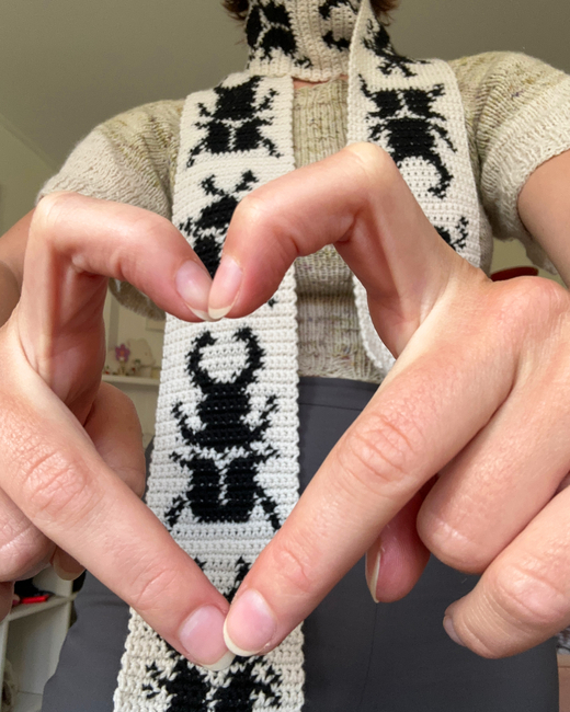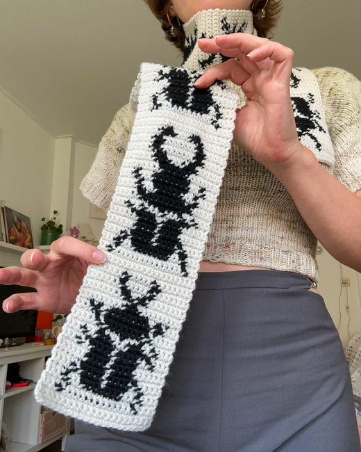 This pattern includes an explanation on how to crochet the Beetle scarf and a graph. The pattern is perfect for beginners. It's pretty simple - the only crochet techniques used are single stitch and tapestry crochet.